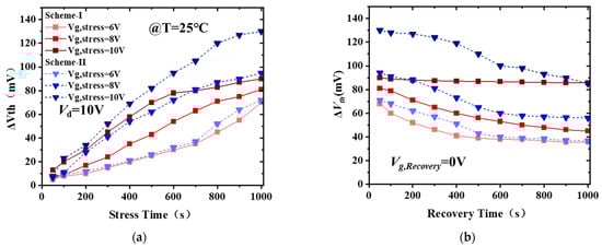 - Lagger, P.; Reiner, M.; Pogany, D.; Ostermaier, C. Comprehensive Study of the Complex Dynamics of Forward Bias-Induced Threshold Voltage Drifts in GaN Based MIS-HEMTs by Stress/Recovery Experiments. IEEE Trans. Electron Devices 2014, 61, 1022–1030. [Google Scholar] [CrossRef]