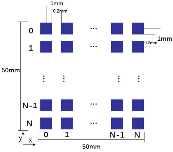In this study, we use an IBP algorithm by Asier Marzo et al. [14] to generate the required dataset for manipulating particles in an air medium using PTA systems. The algorithm sets the frequency of the acoustic waves to 40 kHz, which we also use as the voltage excitation signal of the PTA. To design our array, we consider that Seki Inoue et al. have used single-sided arrays of up to 996 transducers and double-sided arrays of 1992 transducers to levitate large particles [16]. Therefore, we use an array consisting of 50 × 50 transducers with a center-to-center distance of 1 mm and a side length of 0.8 mm for each square transducer. The total area of the array is 50 × 50 . The dimensional geometry of the PTA is illustrated in Figure 1.