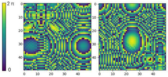 The phase of the acoustic wave emitted by each transducer in the PTA is controlled independently, and its phase distribution can be regarded as an image with a pixel value of . The two images in Figure 2 visualize the distribution of transducer phase values in the PTA. The image uses different colors to represent different phase values, where each pixel value represents the phase value of one transducer. The same color is used for points with the same phase value, and the acoustic wave is periodic so that 0 and 2π represent the same phase value. The holographic acoustic field region is above the XOY plane, and the compound pressure at a location point (x, y, z) in the acoustic field region is labeled as p(x, y, z), as shown in Equation (1), where represents the sound pressure amplitude at the point (x, y, z).