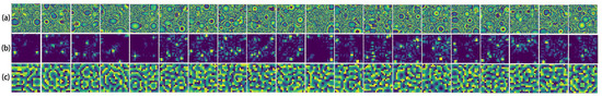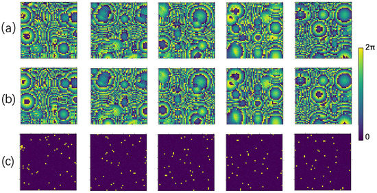 Five samples were randomly selected from the test set to evaluate the learning performance of the RIE-Net neural network by comparing the difference between the predicted phase and the ground truth. Figure 8 shows the prediction performance of the neural network as an image (size 50 × 50). Figure 8a shows the ground truth phase of the transducer in the PTA, and Figure 8b shows the transducer phase obtained from the prediction of the neural network, whose high contrast illustrates the good performance of the RIE-Net neural network. Figure 8c shows the direct difference plot between the predicted phase and the ground truth, and the comparison shows that the difference is slight. The holographic acoustic field generated by the PTA is directly calculated by the forward propagation Equation (8), so it is completely feasible to achieve the reconstruction of the holographic acoustic field by using the neural network to predict the transducer phase in the PTA.