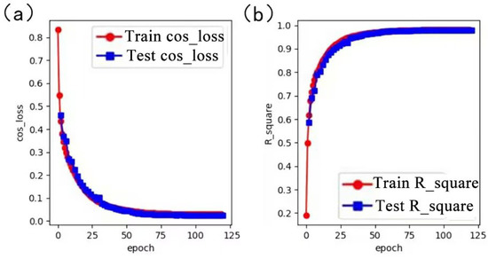 (a) Plot of loss function with the number of loop iterations during training and validation. (b) Plot of coefficient of determination with the number of loop iterations during training and validation.