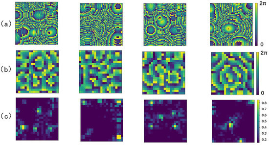 Partial prediction results (chromaticity bars at the right end of the figure are spectral bars and units (0, 2π) represent phases, where the hologram size is 5 × 5 ): (a) Ground truth values of the transducer phase distribution; (b) predicted values of the transducer phase distribution; and (c) plot of the difference between ground truth and predicted values of the transducer phase distribution.