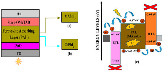 Designing perovskite-solar-cell devices requires a significant focus on selecting an appropriate band alignment in the PSC. Another crucial aspect to consider is the impact of the thickness of the PVK layer on charge extraction, as a thicker PVK layer can lead to increased recombination, which poses a more significant challenge for PSC devices. Previous studies have reported that the PVK layer typically ranges from 0.1 µm to 0.35 µm [16]. Lead-based materials, particularly methylammonium lead iodide (MAPbI3), have been the focus of significant research efforts aimed at enhancing the performance of perovskite solar cells in recent years. However, the toxic nature of lead has limited its widespread use. As a solution, tin (Sn) can be used as a replacement for lead (Pb) in the absorber layer. Previous studies have demonstrated that MASnI3 has a band gap of approximately 1.3 eV, which is lower than that of CsPbI3 (~1.7 eV). As a result, MASnI3 is a promising alternative candidate for use in PSCs [7,17,18]. MASnI3 has a smaller bandgap, which allows it to absorb a wider range of incident photon wavelengths compared to CsPbI3, but the latter exhibits a higher value of VOC, which contributes to higher PSC-device outputs. Despite the fact that the MA cation produces the highest experimental efficiency, its volatile nature can negatively impact the effectiveness of MA-based perovskite solar cells. Additionally, the effective fabrication of the MA cation is not very stable due to its organic nature. Due to these concerns, we decided to exclude the MA cation and instead used the Cs cation. In recent times, the efficiency of Cs-based perovskite has greatly improved compared to MA, so we also included Cs-based perovskite in our solar cell simulation. As a result, we chose CsPbI3 as the absorber layer for our study because MASnI3 is thermally unstable due to the presence of the methylammonium component in the metal compound in PSC devices. This allowed us to evaluate their efficiency and other optoelectronic parameters [19,20].