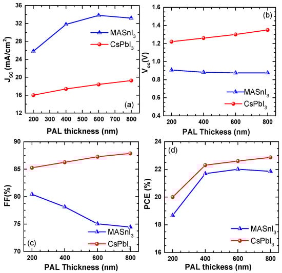 Figure 2. Perovskite-solar-cell outputs over different thicknesses of active layers. (a) short circuit current density (Jsc); (b) open-circuit voltage Voc; (c) fill factor (FF); (d) power-conversion efficiency (PCE).