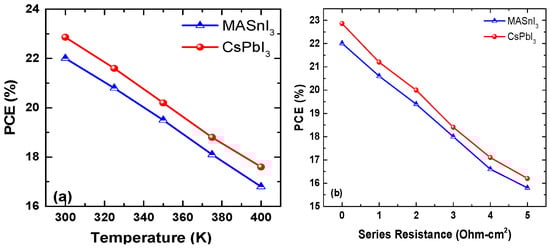 Figure 3. Perovskite-solar-cell outputs over different temperatures (a) and series resistances (b).