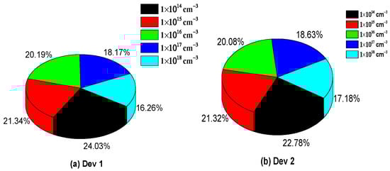 For these reasons, the defect density analysis was used in the present study, as this method helps improving the efficiency of PSC devices. The defectivity of the simulated PSCs studied ranged from 1 × 1014 cm−3 to 1 × 1018 cm−3, as shown in Figure 4. At first, D1 offered a high efficiency of 22.01%, whereas it kept decreasing down to 14.4% when the total defect density increased to 1 × 1018 cm−3, as shown in Figure 4a. A similar trend was attained for D2 which, at a level of total defect density of 1 × 1014 cm−3, obtained the superior value of 22.86%, while 17.1% efficiency was attained for the active layers with a higher defect density, 1 × 1018 cm−3, as shown in Figure 4b. The pie chart describes which efficiency fractions were obtained for both PSC devices. The change in fractions with the defects can be obtained from the pie chart, as depicted in Figure 4 [29].