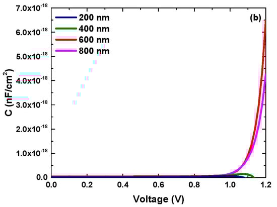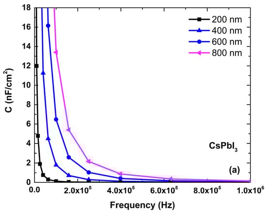 Figure 5a shows the capacitance values for the optimized PSC device at different frequencies and thicknesses. The cutoff value increased as the thickness increased. In Figure 5b, the maximum capacitance value is observed at higher thicknesses, reaching a value of 6 × 1018 nF-cm−2 at a thickness of 800 nm. The value shows that the simulated CsPbI3-based PSC device showed better results for 800 nm thickness than other layer thicknesses of the CsPbI3 absorber. On the other hand, the C–V curve at a simulated frequency value of 106 Hz, shows the impact of frequency on the capacitance–voltage curve for the CsPbI3-based PSC device.