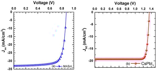 Figure 8. (a,b) J–V of two different perovskite materials at the optimized conditions.