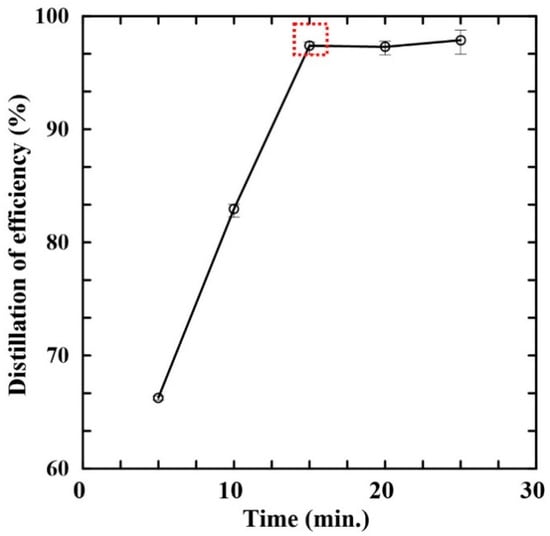 Variation in distillation efficiency over time for sample containing 1000 mg/L of PA. (Experimental operation conditions: condensation channel length: 50 cm; sample volume: 1 mL; DI water volume: 4.5 mL; distillation and condensation temperatures: 150 °C and 20 °C).