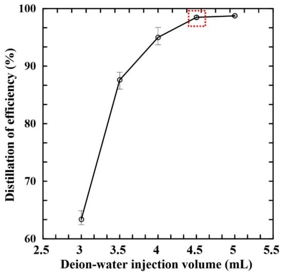 Variation in distillation efficiency with volume of DI water in evaporation chamber. (Experimental operation conditions: distillation time: 15 min; condensation channel length: 50 cm; sample volume: 1 mL; distillation and condensation temperatures: 150 °C and 20 °C).