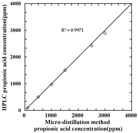 Figure 7 compares the measurement results obtained by the two methods. The high correlation coefficient (R2 = 0.9971) indicates a good agreement between the two sets of results. Moreover, six different PA concentrations (50 mg/L, 500 mg/L, 1000 mg/L, 1500 mg/L, 2500 mg/L and 3000 mg/L) were added to PA-free breads. The analytical accuracy of the proposed microfluidic distillation system and HPLC-PDA detector system is 96.7 ± 1.8%. (Note that the accuracy was evaluated using Equation (1) below.) Thus, the basic feasibility of the proposed system was validated.