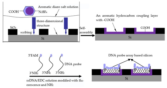 The silicon was scribed in the diazo benzoate solution to generate a self-assembled film. At this time, the end group of the molecular membrane was the carboxyl group (–COOH).Then, under the covalent coupling of N-ethyl-N′-(3-dimethylaminopropyl) carbodiimide hydrochloride (EDC), it reacted with the modified amino group (–NH2) at the 3′ end of ssDNA to form an amide bond, which realized the attachment of ssDNA to silicon via the self-assembled coupling film.