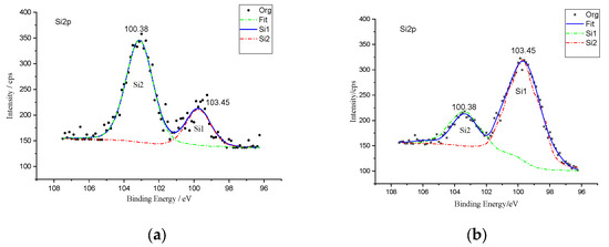 The fine scanning analysis and differentiation of the Si2p peak is shown in Figure 4. The Si2p peak was divided into two peaks. According to the peak attribution table [27], it can be seen that the Si at 100.38 eV is in the Si–C bond region and the Si at 103.45 eV is in the Si–O bond region [28,29]. The ratio of silicon peak area at 100.38 eV and 103.45 eV before the reaction was about 4:1, which indicated that the silicon surface was dominated by silicon oxide. However, the ratio of the two silicon peak areas after the reaction was about 1:3, which showed that the silicon combined with carbon on the silicon surface was greatly increased. This was due to the combination of diazo organic molecules with the Si substrate by a Si–C bond, and the Si–O bond being replaced by the Si–C bond.
