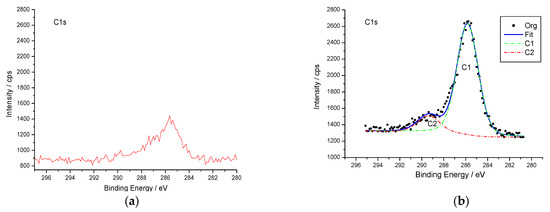 In addition, peak fitting of assembled C1s peaks was also carried out, as shown in Figure 5. According to the standard peak value of carbon provided in the literature, the peak around 285 eV is caused by the contaminating carbons inside the silicon wafer and the adsorption of atmospheric carbon elements, the peak around 287.8 eV is the characteristic peak of the carbon atom in C=O, and the peak around 288.9 eV is the characteristic peak of the carbon atom in –COOH. This confirms that the benzoate diazo salt molecules ending in–COOH had been bound to the silicon surface.
