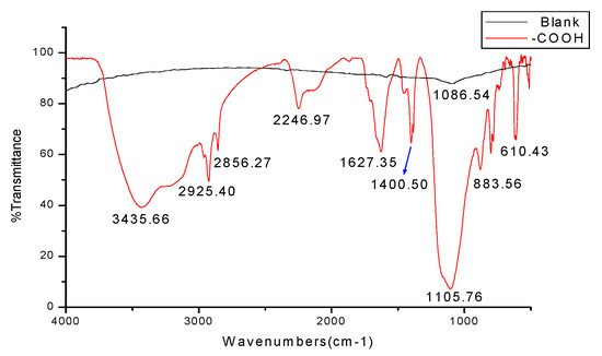 Figure 6 shows the infrared spectra obtained from the blank silicon wafer and the silicon surface modified with diazo benzoate film by KBr Pellets. The blank silicon terminated with oxygen basically had no other obvious absorption peak except for the characteristic strong Si–O–Si absorption band at 1086.54 cm−1. This was mainly used for comparative analysis. For the self-assembled film scribed in benzoate diazo salt solution, the structure of benzoate was attached to the silicon surface. According to the position and attribution table of the characteristic absorption peak of aromatic hydrocarbons [31], the peak at 1680 cm−1~1620 cm−1 was the vibration absorption peak of the connection between an aryl group and –COOH. It was present in the spectrogram.