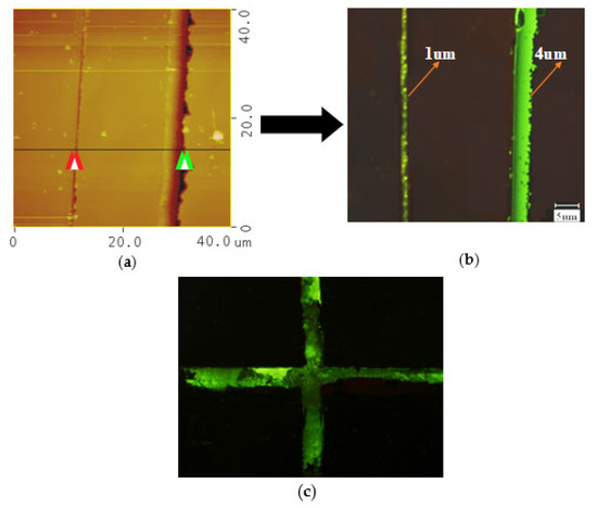 As shown in Figure 7, regular straight lines with green fluorescence could be seen under the fluorescence microscope at 400 times magnification, which were all formed by diamond cutting tools. Figure 7a is the AFM image measured after scribing the silicon surface in solution, and Figure 7b is the corresponding fluorescence image after connecting ssDNA. The line-widths of the two lines were 4 μm and 1 μm, respectively. Although the line-widths of the two lines were quite different, the fluorescence signals were relatively strong. This indicated that ssDNA was successfully connected to the self-assembled film on the silicon surface.
