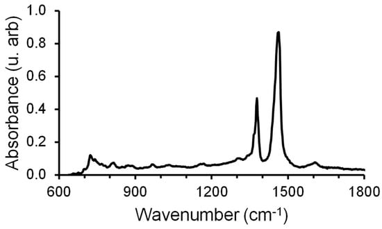 The experiments used an oil sample with a density of 852 kg/m3 and a viscosity of 17.8 mPa s. The content of various organic and inorganic substances and their compounds was determined using Fourier transform infrared spectroscopy (FTIR). The FT-IR method is based on the microscopic interaction of infrared light with a chemical substance through an absorption process, and as a result, gives a spectrum unique to a chemical substance, serving as a “molecular imprint” []. Figure 1 shows the absorption spectra of various oil samples taken with an IR-Fourier spectrometer Nicolet 6700 (Thermo Fisher Scientific, Waltham, MA, USA). The optical density at the maximum of the absorption bands was determined, as well as the spectral coefficients (see Table 2): C1 = D1600/D720 (aromatics); C2 = D1710/D1465 (oxidation); C3 = D1380/D1465 (branching); C4 = (D720 + D1380)/D1600 (aliphatic); and C5 = D1030/D1465 (sulfur content).