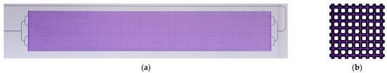 Photographs of a microfluidic chip: (a) microfluidic chip with porous media; (b) an enlarged fragment of a microfluidic chip.