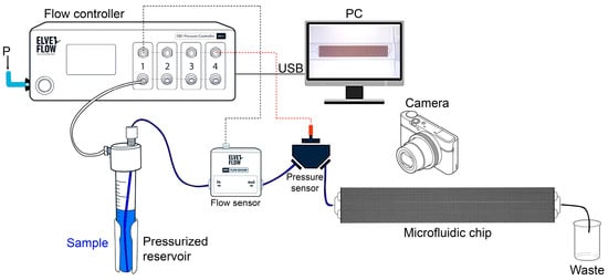 A fluid flow sensor MFS (Elveflow, Paris, Île-de-France, France) was used, operating in the range from 0.03 to 1000 µL/min with an accuracy of ±5% of the measured value, the sensor response time was up to 70 ms. A pressure sensor MPS (Elveflow, Paris, Île-de-France, France) was also used, measuring in the range from −15 to 100 psi, with an accuracy of ±0.2% of the maximum value.