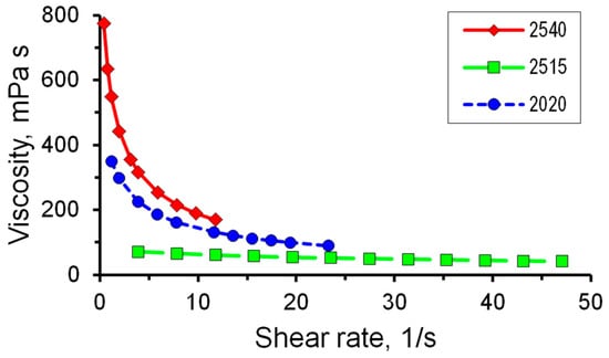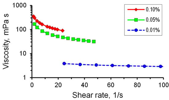 Similar measurements were conducted for polymer solutions containing polyacrylamide of different brands. The mass concentration was 0.1%. The value of the viscosity of solutions with a concentration of 0.1% decreases for samples of all polymers with an increase in the shear rate (see Figure 6). This dependence is most pronounced for PAA 2540; the viscosity changes slightly with varying shear rates for PAA 2515.