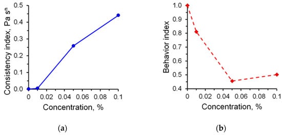 The rheological parameters of 0.1% polymer solutions polymer A2020: (a) consistency index; (b) behavior index.