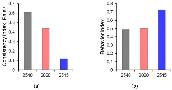 where µ is viscosity, γ is shear rate, kv is consistency index, n is flow behavior index. Calculations of rheological parameters (approximation of the viscosity curve) were carried out using the MathCad software (PTC Inc., Boston, MA, USA). The coefficient of determination R2 was higher than 0.999.