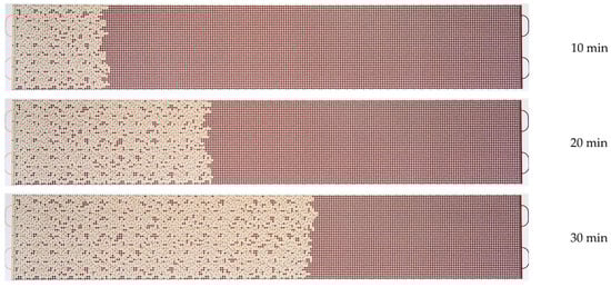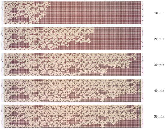 A series of microfluidic experiments on oil displacement using polymer solutions has been carried out. An oil sample, as well as several solutions of polyacrylamide polymers, were used as displacement fluids. The solution flow rate was 0.5 µL/min. Figure 10, Figure 11 and Figure 12 show the patterns of oil displacement by solutions with different concentrations of polymer 2540. As can be seen from Figure 10, the front of the solution with a low concentration of polymer 2540 (0.01%) moves uniformly at the beginning of the oil displacement process, and then it begins to change: viscous fingers are formed due to an unstable polymer solution-oil interface. However, the displacement process changes when flooding with solutions with a higher concentration of polymer 2540 (see, for example, Figure 11 and Figure 12). The polymer solution displacement front is broad and uniform.