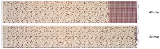 As shown in Figure 10, a 0.01% solution of 2540 breaks through at the exit of the micromodel approximately by the 35th minute. Until this time, the oil displacement efficiency increases almost linearly in proportion to the flow rate of the solution. After the breakthrough of the solution, the flow is established, and the oil displacement coefficient remains practically unchanged in the future. The coefficient of oil displacement from the microfluidic chip with 0.01% solution 2540 was 47%, while in the case of displacement with water, it was 44% (Figure 13). Once the oil displacement process is established (see the last photographs of Figure 10), there are large areas filled with oil.