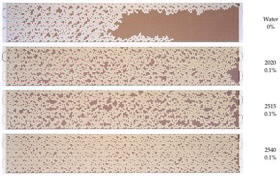 Further, similar experiments were carried out on flooding a microfluidic chip with solutions of polyacrylamide of different brands (2020 and 2515), differing in molecular weight and charge density. Figures S1 and S2 (see Supplementary Files) explicitly show the dynamics of the process of oil displacement by different polymers at a concentration of 0.1%. A qualitative comparison of the residual distribution of oil and solutions at different concentrations of polymers is presented in Supplementary Files (Figures S3–S5).