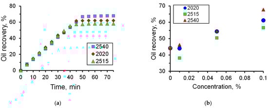Oil recovery: (a) The dependence of the oil recovery on time for 0.1% polymer solutions; (b) Oil displacement efficiency as a function of polymer concentration.