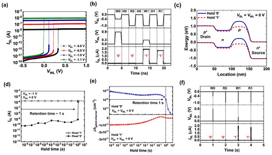 Figure 2. (a) Transfer characteristics of 1T DRAM cell. (b) Timing diagram of 1T DRAM cell operation. (c) Energy-band diagram of 1T DRAM cell under holding ‘0’ and ‘1’ operations. (d) Retention characteristics of 1T DRAM cell. (e) Variation in the ∆hgated-channel of 1T DRAM cell under holding ‘0’ and ‘1’ operation. (∆hgated-channel = hinithgated-channel). (f) Timing diagram of 1T DRAM cell with a holding time of 1 s.