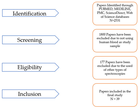 For this paper, a review was conducted using the standard methodology illustrated in (Figure 1). The following databases were searched for peer-reviewed journal articles published between 2019 and 2023: PubMed, MEDLINE, PMC, ScienceDirect, and Web of Science. Before 2019, the number of papers representing ML methods applied to FTIR spectroscopy was low (the authors only identified four papers under this criterium) and, consequently, not significant [9,10,11,12], so this time period was not considered in the search process. After 2019, the number of papers increased dramatically, and the quality of the data showed promising outcomes [13,14], allowing the availability of data to perform a more detailed review analysis. In addition to the database search, relevant articles were manually identified by reviewing the reference lists of the included articles to investigate the effectiveness of the reference lists for the identification of additional, relevant studies. The search terms used were “Machine learning”, “Machine learning AND FTIR OR Attenuated Total Reflectance (ATR)-FTIR spectroscopy”, and “Machine learning AND FTIR OR ATR-FTIR spectroscopy AND human blood”. No language restrictions were applied, and Excel software was used to store the articles retrieved from the databases and screen for duplicates. Eligible studies included those that analyzed prospective or retrospective observational data, reported quantitative results for the experiment and evaluation made for the method used. The papers’ data were separated into two tables, whereby in one table (1), the study’s targeting disease, the study type, the sample source methodology, and the FTIR analysis, among other details, are described, and the ML methods, metrics, and validation approach are described in another table (2).