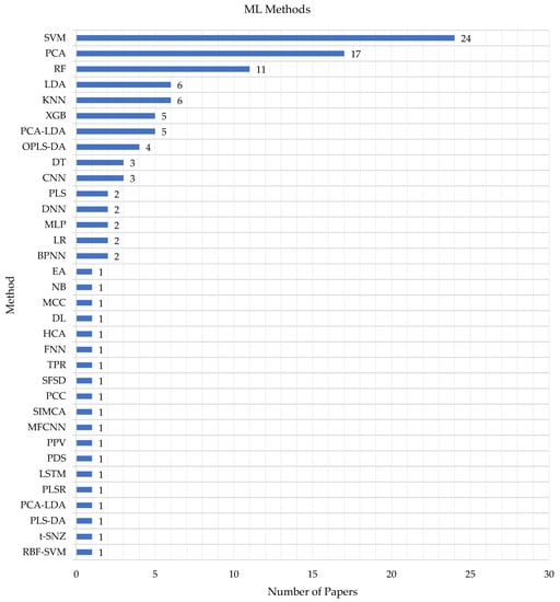 Table 2 outlines the various ML algorithms used for classification or prediction in the selected studies, including SVM (featured in 24 studies), PCA (featured in 17 studies), the KNN and XGB [50] (featured in 6 and 5 studies, respectively), RF [51] (featured in 11 studies), PCA-LDA and OPLS-DA (featured in 5 and 4 studies, respectively), and LDA [52] (featured in 6 studies). The other algorithms/methods presented in the studies were only reported once.