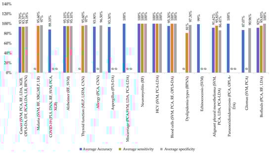 Metrics to evaluate the average ML performance in FTIR applied to different diseases. For each disease, the most common ML methods are reported. The blue column represents the average accuracy, the red column represents the average sensitivity, and the green column represents the average specificity.