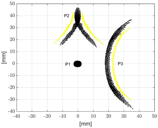 Figure 6. The piezo-sensors P1, P2 and P3 of the Shaped Sensors Optimal Cluster, after applying the Error Diffusion quantization technique (in black color, the positive sensors shape function parts, in yellow color, the negative sensors shape function parts).