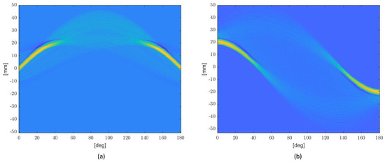 Figure 7. The Radon Transform of the sensors after applying the error diffusion quantization technique: (a) Actual RT of P2; (b) Actual RT of P3.