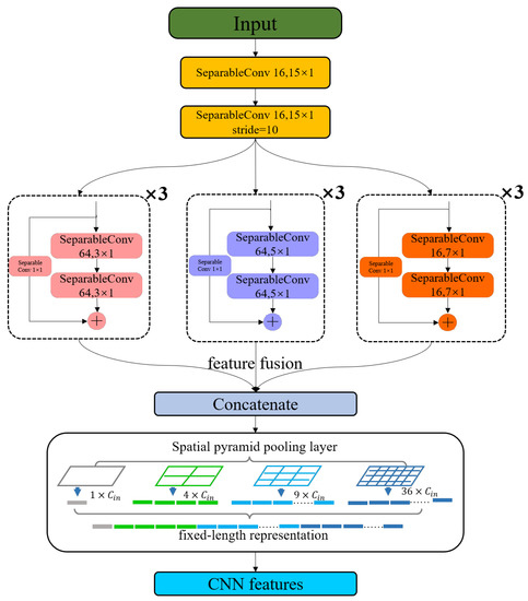 CNNs can extract data features using local receptive fields, weight sharing, downsampling, and other methods [10], which are commonly used as the backbone for feature extraction due to their ability to capture local features and translation invariance [37]. The depthwise separable convolutions were utilized in the Xception architecture developed by Google and demonstrated enhanced performance in image classification [38]. A depthwise separable convolution consists of a depthwise convolution and a pointwise convolution. The depthwise convolution is a spatial convolution performed independently over each channel of an input; and then the pointwise convolution is a 1 × 1 convolution projecting the channel output by the depthwise convolution onto a new channel space. For multi-lead ECG signals, the spatial convolutions are applied to each lead, and then the feature map of every channel is projected onto a new space, enabling ECG details to be extracted from every lead. Actually, our CNN-based backbone is built on the original Inception module with residual connections, where conventional convolutions are replaced by depthwise separable convolutions. Specific configuration details are shown in Figure 2. In the early stage of this part, we use a large convolution kernel with a size of 15, increasing the receptive field of the convolution network and facilitating the detection of large-scale waveforms. In the middle, we utilize the residual network structure and Inception structure. To learn information from different scales, we employ three different scales of convolution kernels. At the end of the CNN-based backbone, we introduce the spatial pyramid pooling layer to convert the different dimensions of the final output feature map into a fixed-dimensional CNN feature without considering the length of input signals [39]. As depicted in Figure 2, we divide the output feature graph from each lead in the first part into 36 blocks, 9 blocks, 4 blocks, and 1 block, and then compute the maximum pooling for each block individually. Therefore, the model can accommodate arbitrary-length ECG signals.
