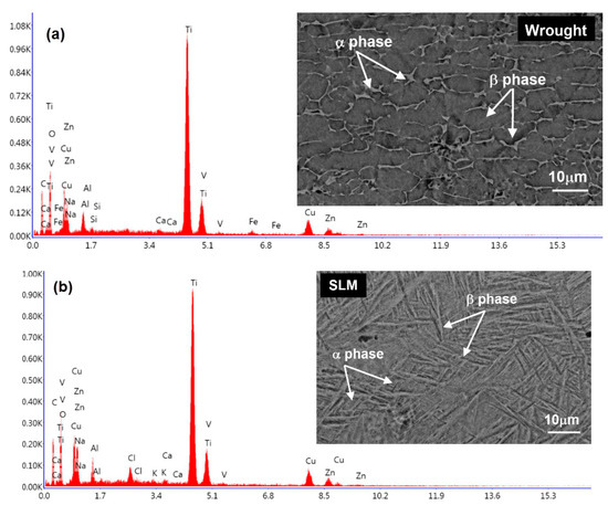 Figure 2. Microstructure and EDS analysis of (a) wrought Ti-6Al-4V and (b) SLM Ti-6Al-4V.