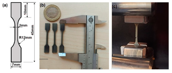 Figure 3. Tensile test specimens and tensile test procedure: (a) dimensions of the tensile test specimens (mm), (b) manufactured Ti-6Al-4V tensile test specimens, and (c) tensile testing of the Ti-6Al-4V tensile test specimens.