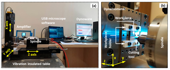 Figure 4. High precision micro machining system, (a) general view of the micro-milling test equipment and (b) exhibition of the micro tool, workpiece, and dynamometer with details.