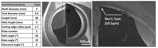 Figure 5. Geometric properties and SEM image of the cutting tool used in micro-milling tests.