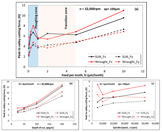 Figure 7. Variation in peak-to-valley cutting forces during micro-milling of SLM and wrought Ti-6Al-4V parts depending on (a) feed per tooth, (b) depth of cut, and (c) spindle speed.