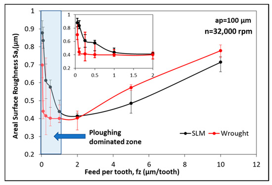 Figure 8. Variation in surface roughness with feed per tooth for SLM and wrought material.