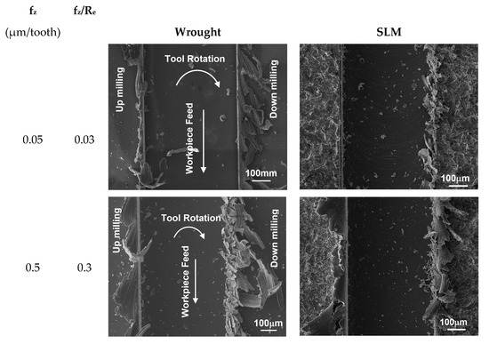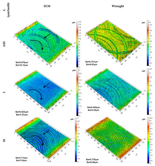 The surface roughness (Sa) increased for feed rates smaller than 1 μm/tooth, exhibiting a ploughing-dominated zone. For feed rates larger than 2 μm/tooth, SLM Ti64 exhibited lower Sa values compared to wrought Ti64, indicating a better surface quality.