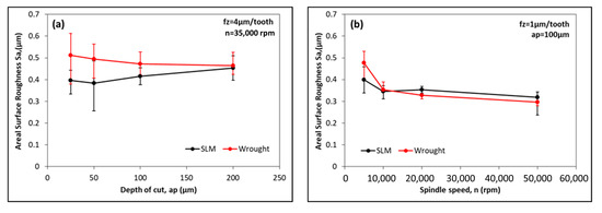 Figure 10 illustrates the effects of the cutting depth and spindle speed on surface roughness. At low depths of cut, the difference between SLM and wrought material is at the maximum and a better surface is obtained in SLM material (Figure 10a). As the depth of cut increases, the difference in Sa values decreases, and for ap = 200 µm, the Sa values obtained for both materials become very close to each other. In addition, the amplitudes of the error bars increase for ap ≤ 50 µm. In a study by Aslantas et al. [50], it was noted that the Sa values remained constant for the wrought Ti64 alloy at a depth of cut of up to 200 µm. In this study, it can be inferred that the Sa values do not change significantly or remain relatively constant as the depth of cut increases. In Figure 10b, the Sa variations with the increasing spindle speed are given. Sa values tend to decrease with an increasing spindle speed for both materials. A decrease in the spindle speed corresponds to a decrease in the cutting speed. It is well-known that the likelihood of BUE formation increases at medium and low cutting speeds [51]. In this study, it is thought that the factor which caused the increase in Sa values at speeds lower than n < 10,000 rpm was BUE formation. Another result which was obtained is that the Sa values obtained in the SLM and wrought materials for n ≥ 10,000 rpm are very close to each other.