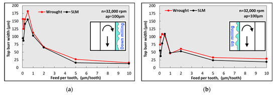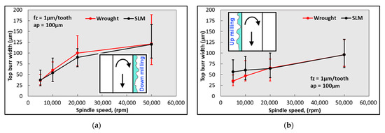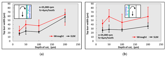 Figure 11. Top burr width variation in down- and up-milling for both materials; (a) down-milling and (b) up-milling.
