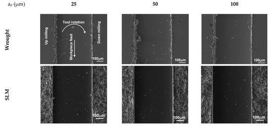 Figure 13 presents the change in the burr width depending on the cutting depths on the up- and down-milling side. At all depths of cut and on both milling sides, the burr width obtained in the SLM material is lower than in the wrought material. Even in up-milling, the burr width in the SLM material appears to be independent of the cutting depth. However, a similar trend was not observed in the case of up-milling. In addition, the burr widths obtained for the wrought material exhibit significant variation, as indicated by the error bars. This variation can be attributed to the material’s more ductile behavior. Since plastic deformation is less common in the machining of SLM material (due to its hardness being higher) than in wrought material, narrower and finer burrs can be expected when machining SLM material [31]. These findings are in agreement with the outcomes of micro-ball end milling Ti64 presented by Chen et al. [60]. It is known that, as the depth of cut rises, the contact area between the workpiece and the tool goes up as well, the extrusion and ploughing process intensifies, and the cutting forces increase. Therefore, more material deformation is induced and bigger top burrs are shaped through the cutting edge [61]. SEM images of burr widths at different cutting depths for both materials are given in Figure 14. It can be seen that the burr width in the SLM material is significantly lower. According to the results shown in Figure 13 and Figure 14, it is suggested to consider the depth of cut as 100 µm for the maximum material removal rate in SLM material.