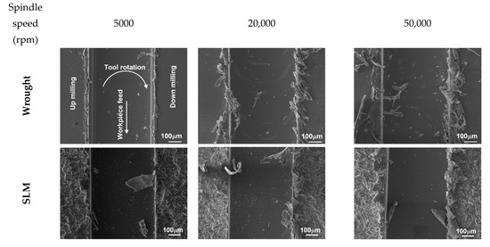 The variation in the burr widths formed on the up- and down-milling sides with an increasing spindle speed is given in Figure 15. Increasing the spindle speed also causes the burr widths to increase. Similar to the results obtained in Figure 11, it is possible to say that the burr widths obtained in down-milling are higher. As the spindle speed increases, the friction and extrusion time on the up-milling side is shortened, resulting in a smaller burr size. However, on the down-milling side, the chip becomes harder to break and stays above the slot due to thermal softening influence during micro-milling. This causes the burr width to be higher. However, contrary to the results obtained in Figure 13, the difference between SLM and wrought material is minimal. The results obtained in this study are consistent with those obtained by Özel et al. [62]. Aslantas et al. [63] also state that the spindle speed increases the burr width in the micro-milling of Ti64 alloy. However, Wu et al. [64] emphasize that the burr width decreases with an increasing spindle speed for pure copper material. It is thought that this difference is due to the work material. Figure 16 shows SEM images of the top burrs for different spindle speed values. In the wrought material, the burrs take a more needle-like shape with an increasing spindle speed. Conversely, in SLM material, the burrs are more irregular at higher spindle speed values and, at 50,000 rpm, the burrs become wavy and more continuous.
