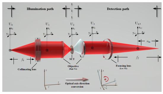 Figure 4 displays the unfolded model of a DCM. To simplify, pre-focal and post-focal light-field distributions represent the pre-focal and post-focal situations, respectively. This is due to the previously mentioned symmetry. The DCM optical paths can be divided into illuminating and detecting optical paths, which are separated by the sample under test reflection process.