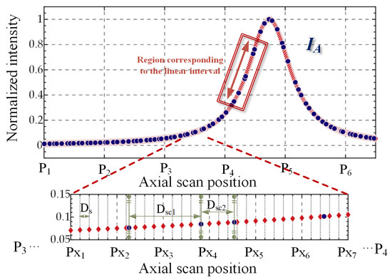 Figure 6 shows the mathematical model constructed above. When the micro-objective is driven by the micro-objective driver with a small step length and negligible positioning error, and by the linear motor with a long stride and a large amount of shaking, the data are obtained from photodetector A, namely, the normalized energy relation curve with axial displacement. Red represents ideal uniform data with a small step length, step size Ds, and negligible positioning error. The blue data are the data with large and uneven positioning errors, as shown in Figure 6. Dsc1 and Dsc2 are the sampling intervals when the positioning accuracy of the transmission mechanism is insufficient. At the same signal-to-noise ratio, the zero-crossing position obtained using the blue data yielded a large error. The PCC is a common similarity measure that can handle multidimensional data clustering classes. The minimum PCC value was −1 (opposite vector), and the maximum PCC value was +1 (same vector). Owing to its excellent recognition and matching abilities, we hope to use this algorithm effectively to solve the existing problems in DCM systems.